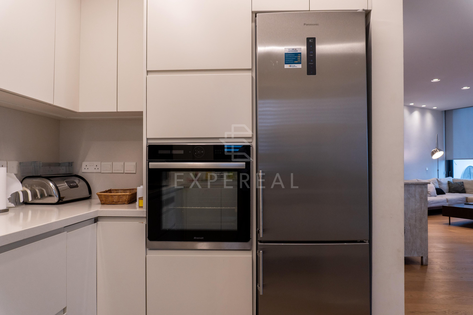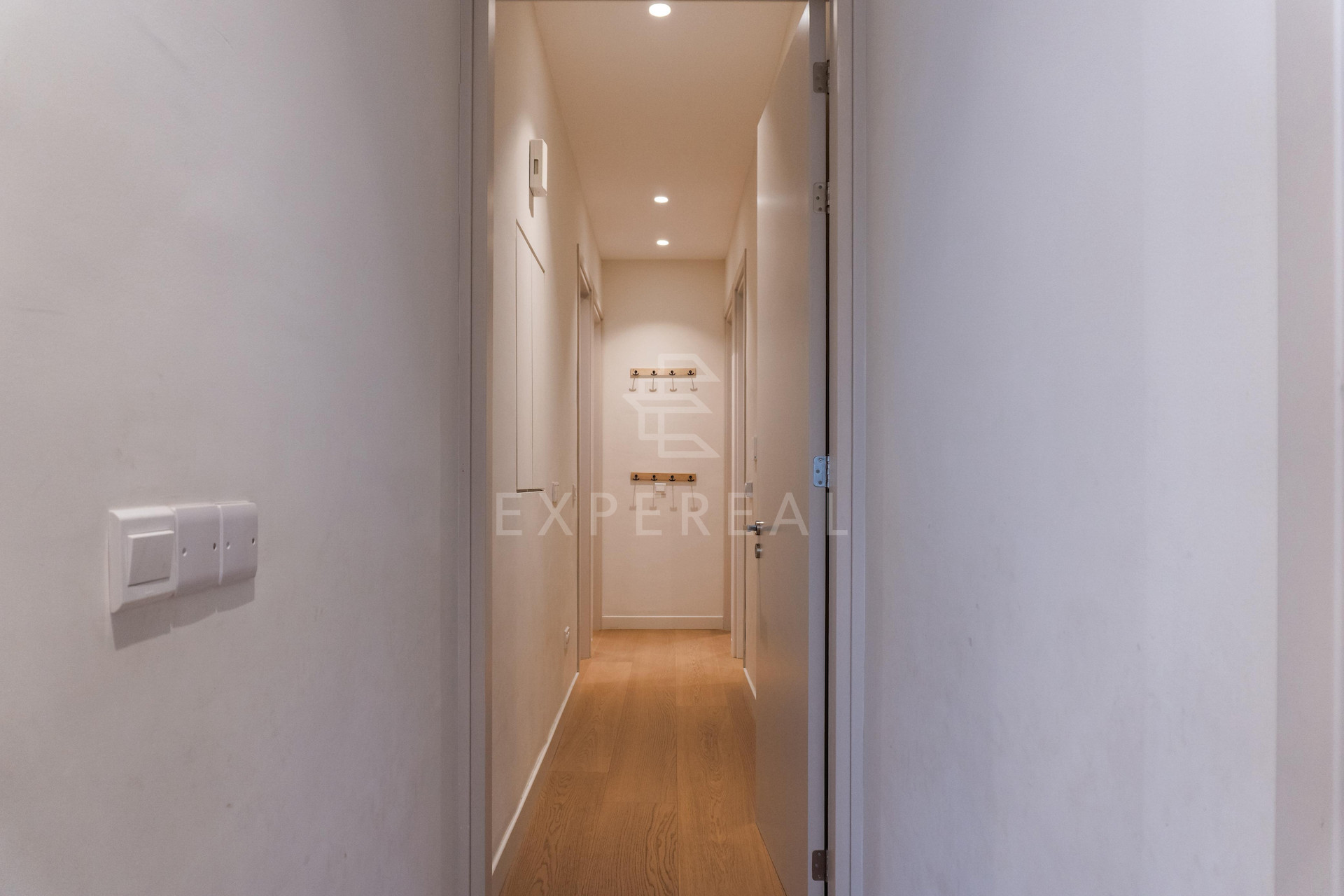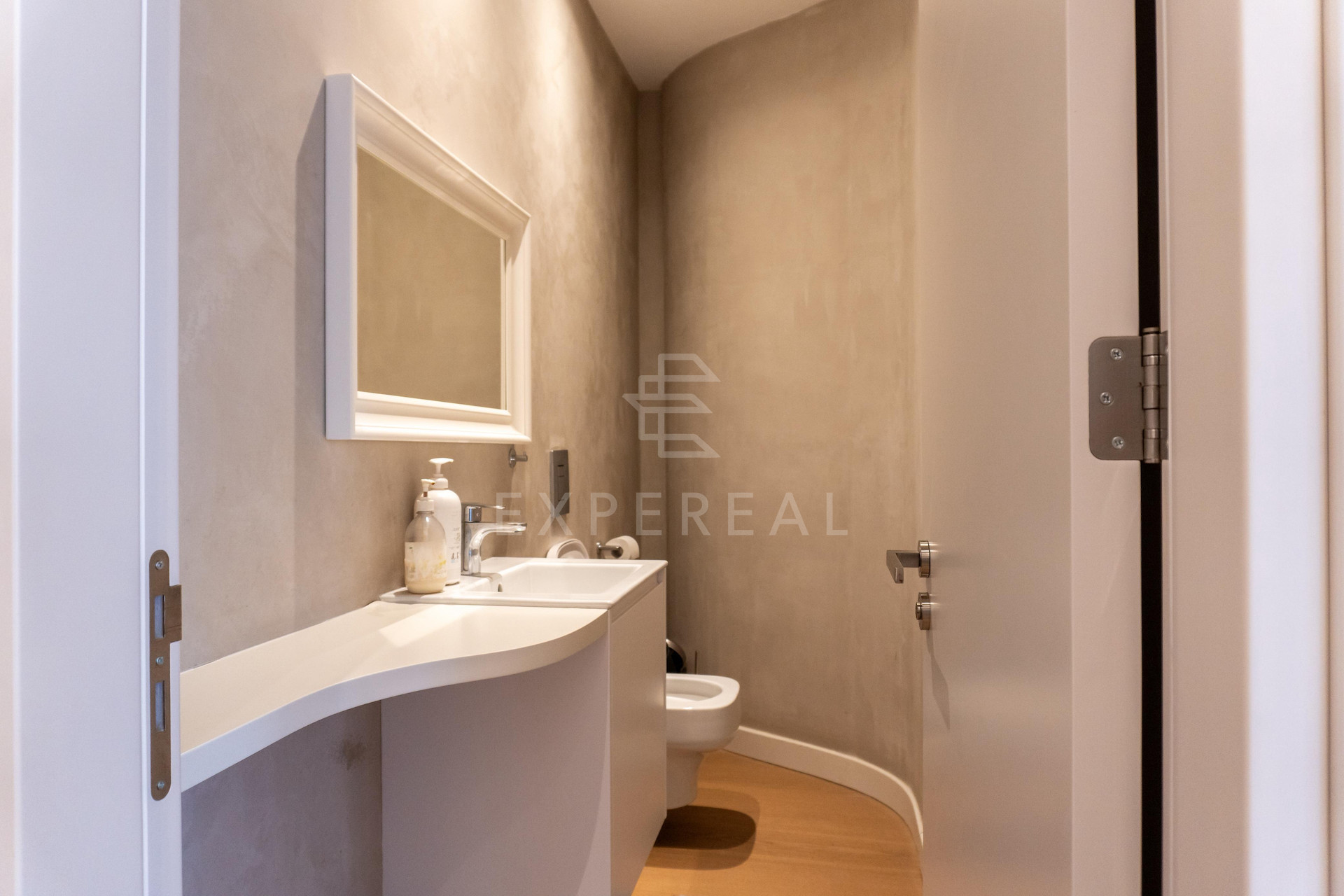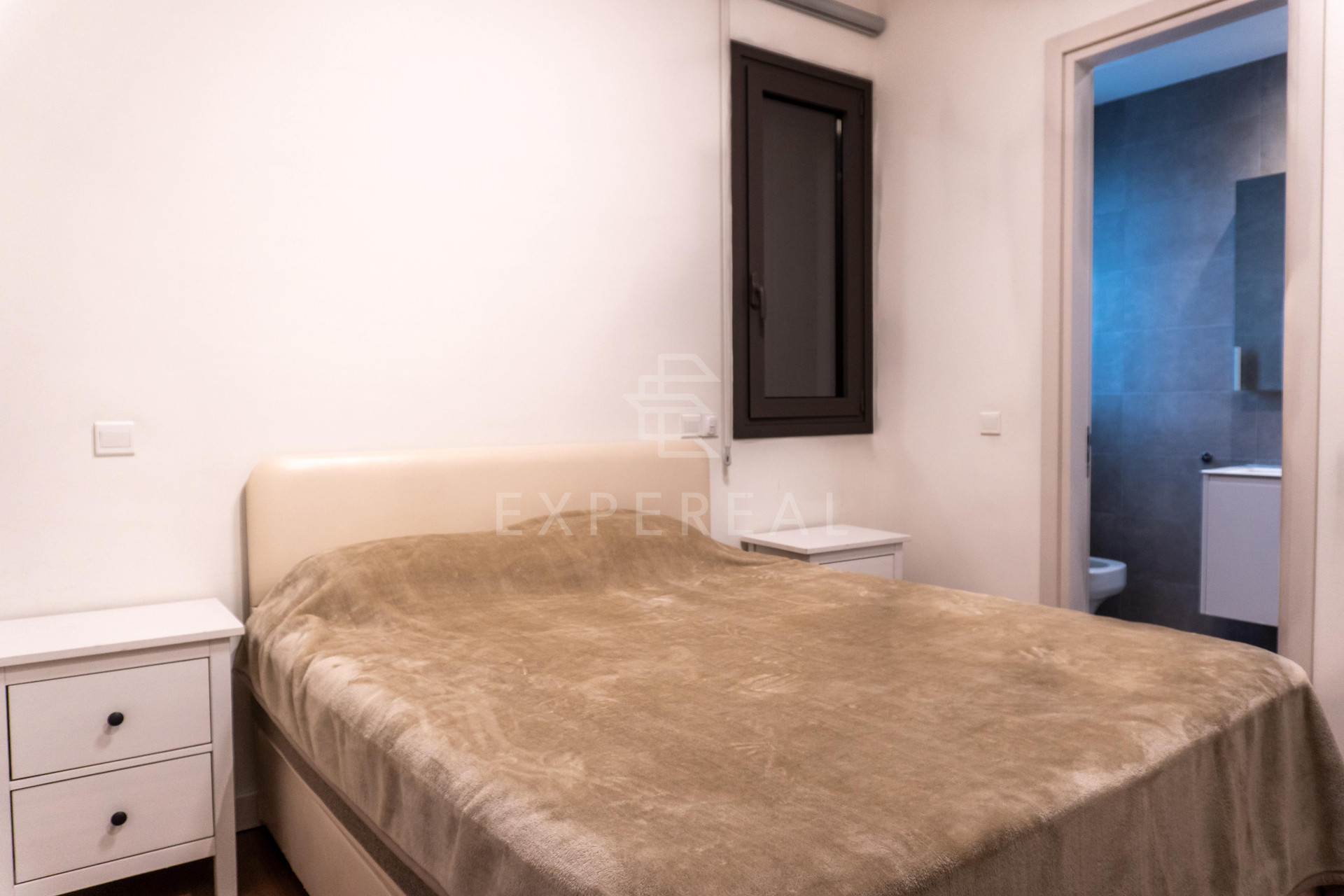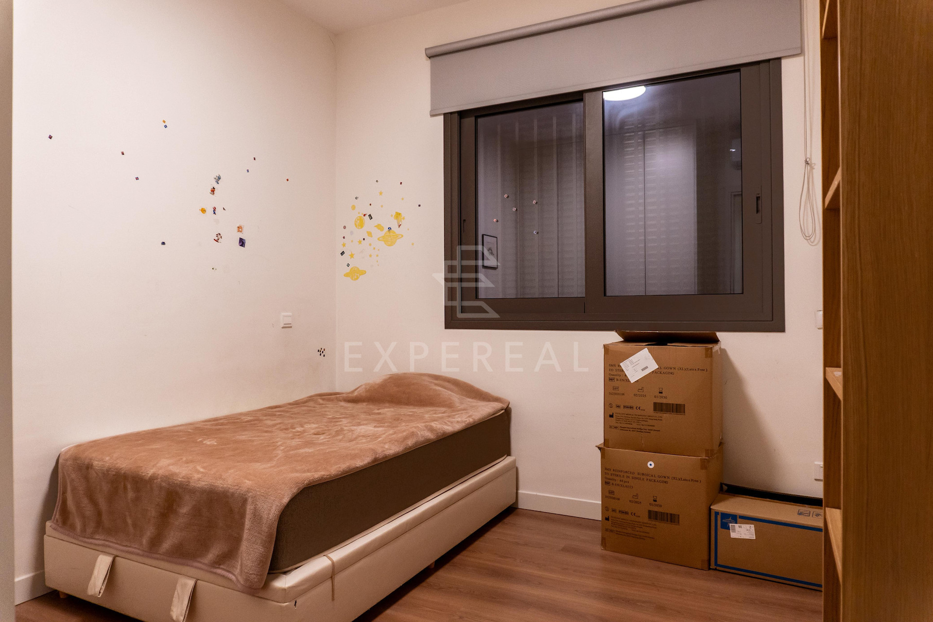 The apartment features an open-plan living/dining area, a functional kitchen, and ample storage space. It is equipped with underfloor heating, air-conditioning units in all areas, three W.C.s, a main shower, an en-suite shower in the master bedroom, a storage room in the basement, and a covered parking space in a controlled-access area with a barrier gate.
